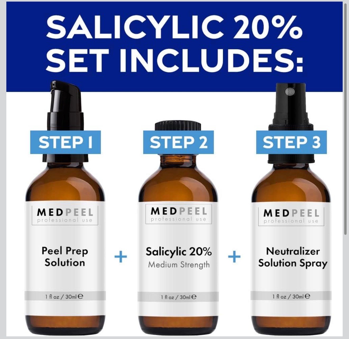 MedPeel Salicylic Acid 20% Essential Peel Kit, Includes Peel, Prep, Neutralizer, Medium Strength Professional Grade Chemical Face Peel for all Skin Tones, 1oz/30ml (Kit of 3)