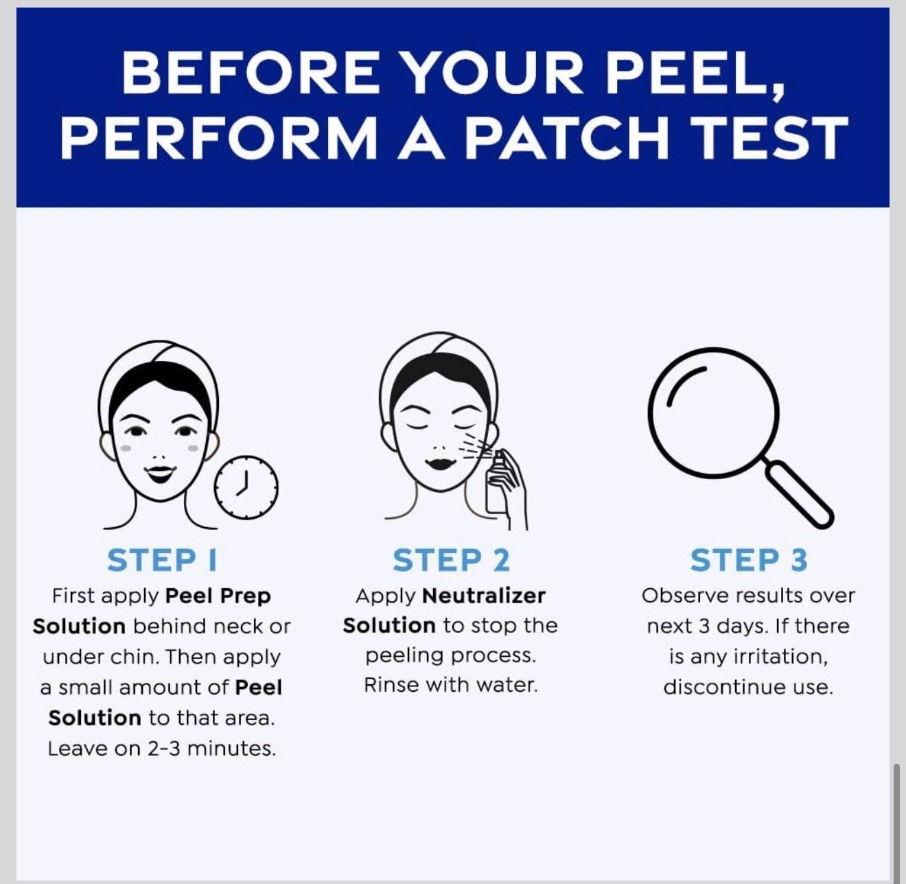 WARNING/PATCH TEST: We strongly recommend that you conduct a patch test 3 days prior to your peel. Apply Peel Prep behind the neck or under chin. Apply small amount of peel to the area.